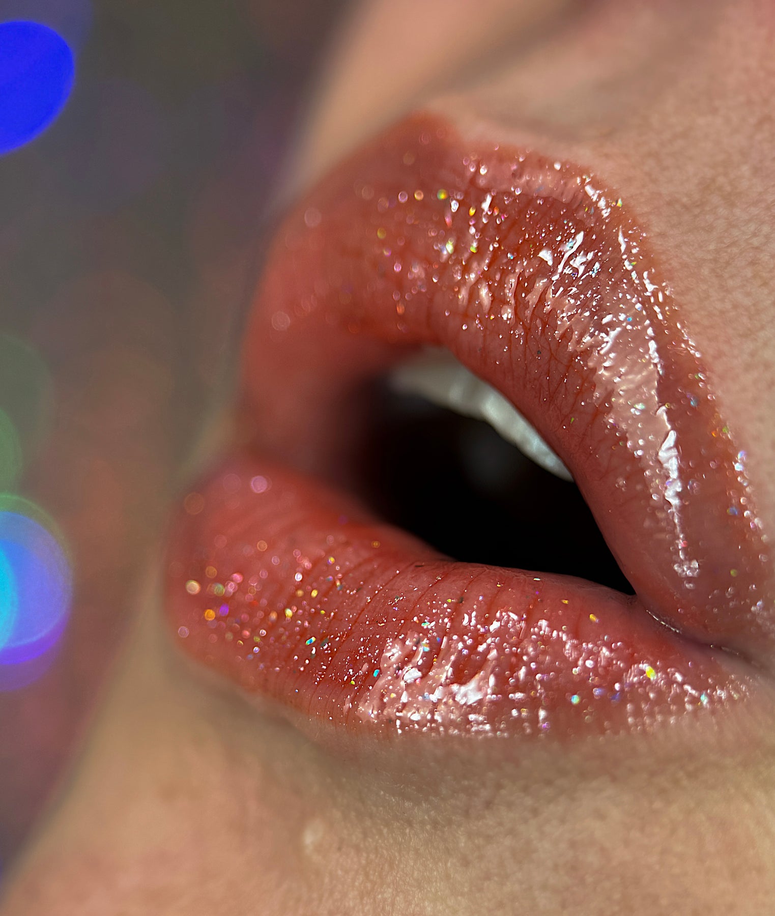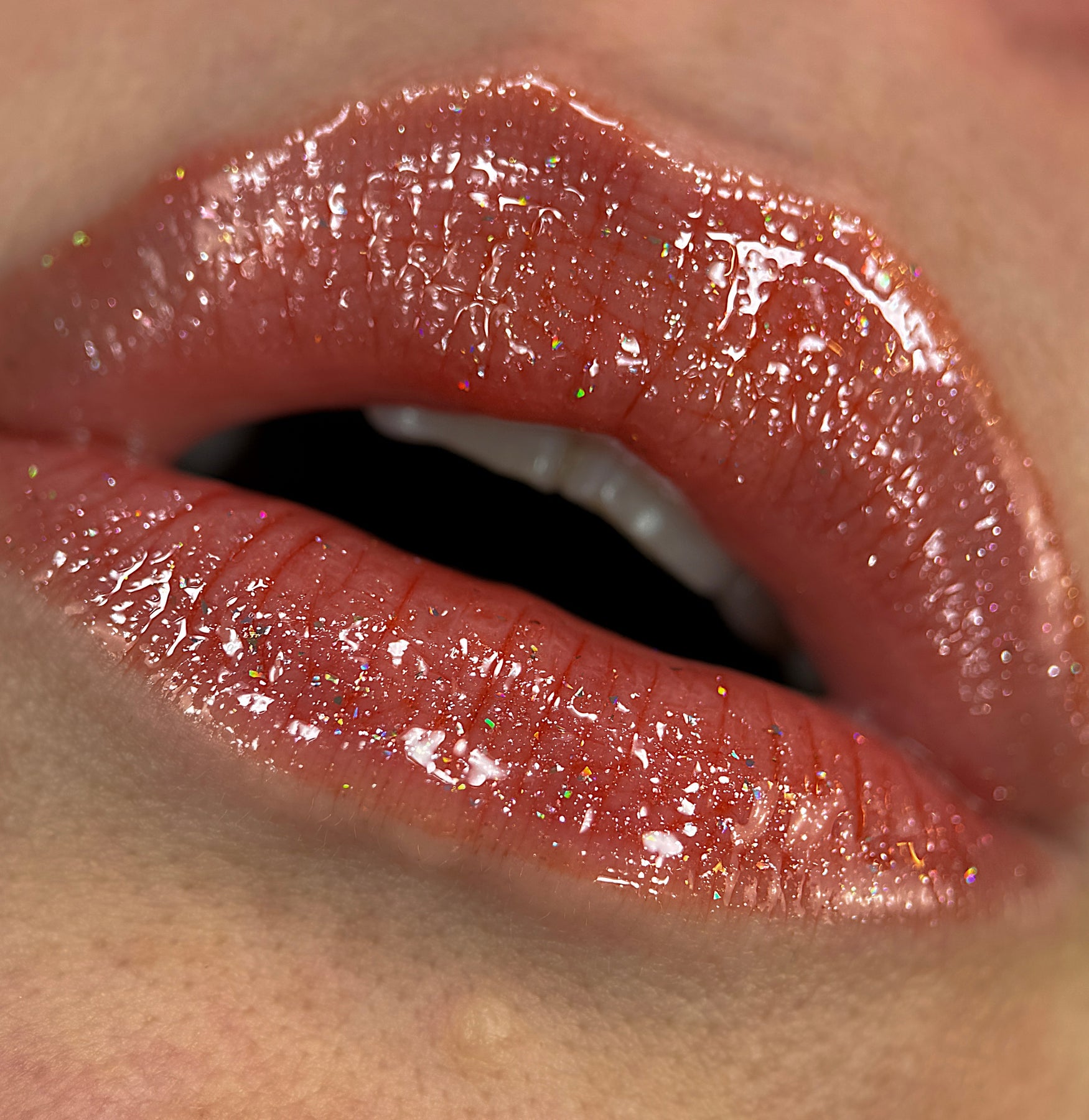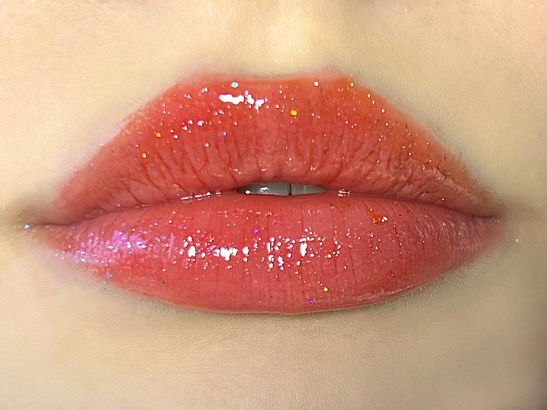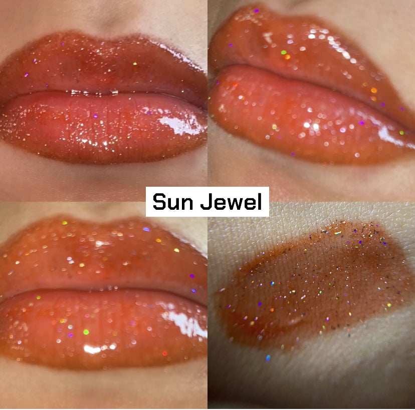 “Sun Jewel” is an orange pink toned coral gloss with holographic sparkles that is moisturizing and made with only vegan ingredients.
